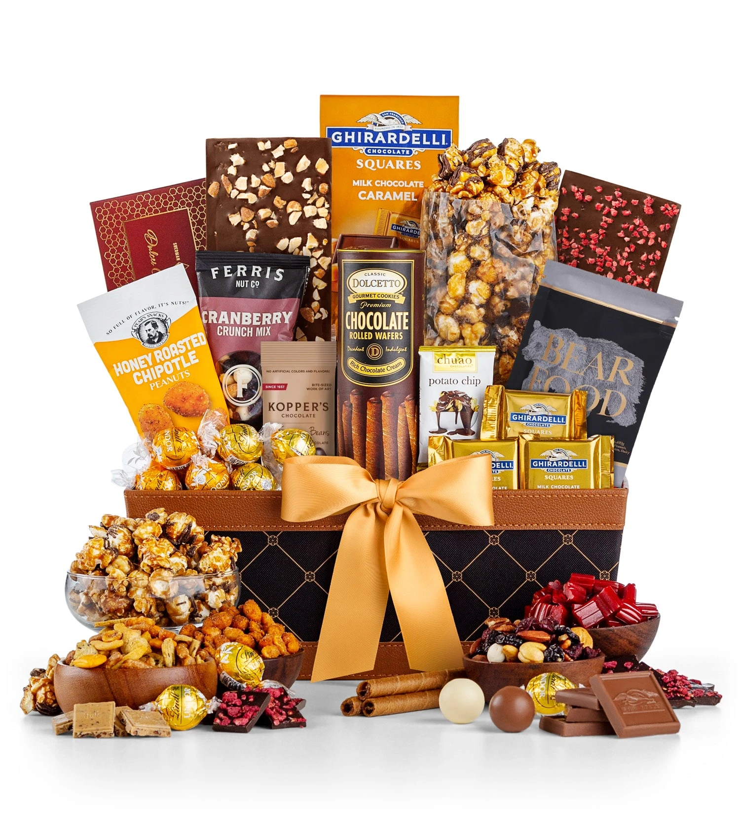 Always a customer favorite, this exceptional gift delivers a bountiful collection of irresistible gourmet treats. With both sweet and savory indulgences packed in a handsome keepsake gift basket, this gift is just right for any occasion.