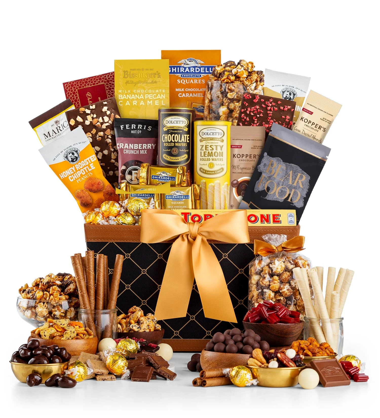 When the occasion calls for something spectacular, the Golden Gourmet Supreme gift basket fits the bill. This generous arrangement of sweet and savory gourmet delights is designed to impress and deliver the WOW factor!