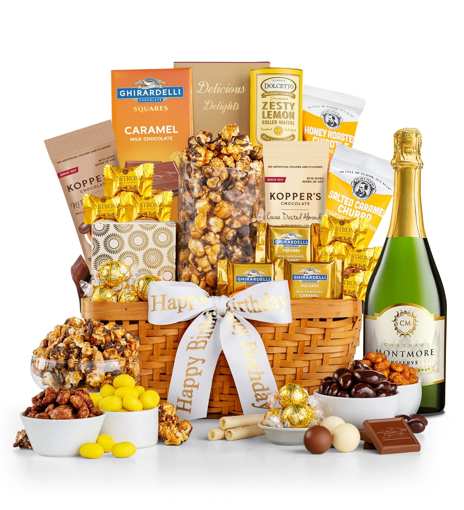 Celebrate birthdays in style with our exquisite Happy Birthday As Good As Gold gift basket, featuring the luxurious Chateau Montmore Reserve Sparkling. This perfect pairing is designed to make any birthday unforgettable.