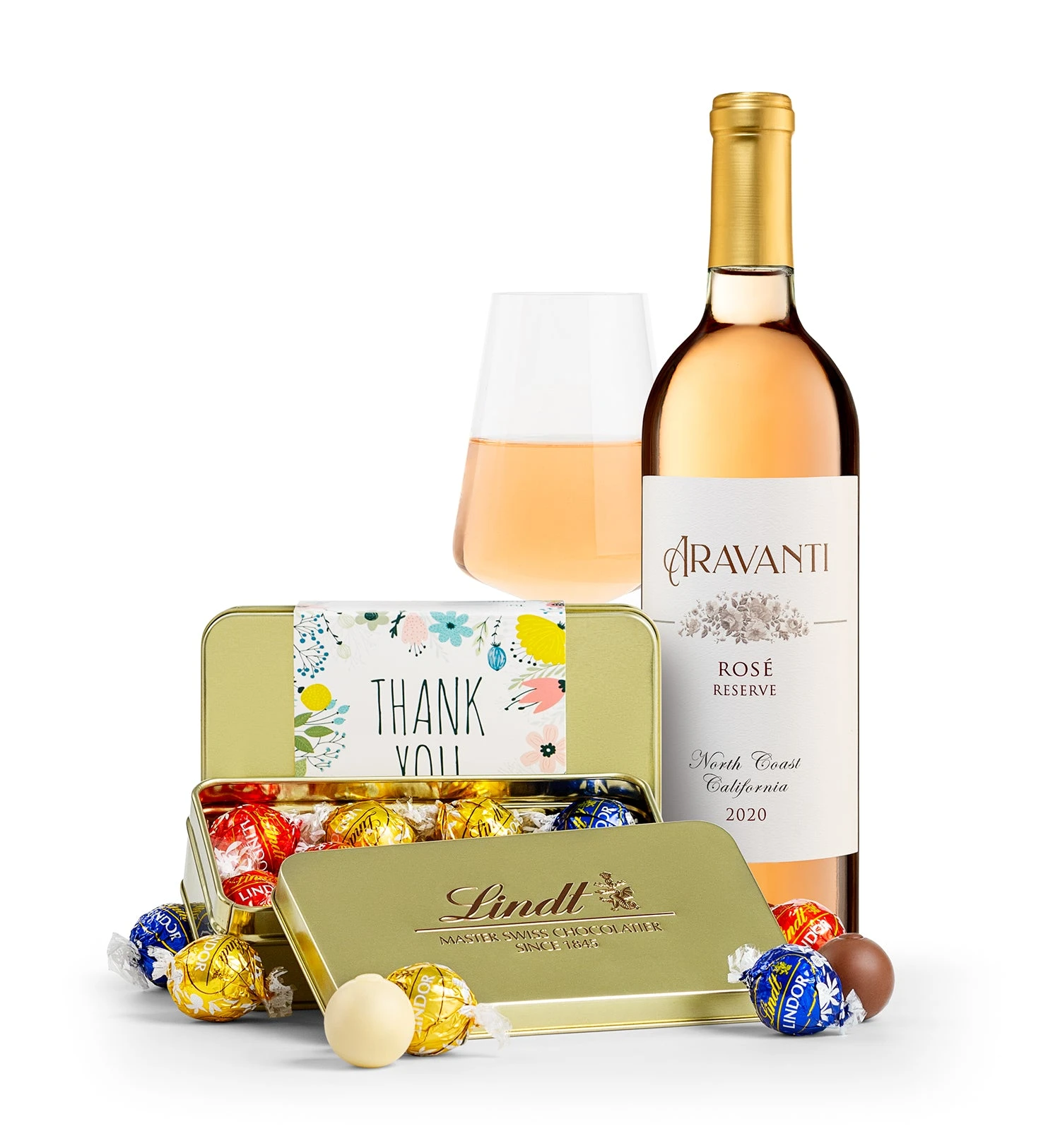 A sweet and elegant way to say “thank you.” This beautifully curated gift pairs the LINDOR Thank You Truffle Tin, filled with irresistibly smooth, melt-in-your-mouth chocolate truffles, with a bottle of Aravanti Rosé—a crisp and refreshing wine with delicate notes of red berries and citrus.
