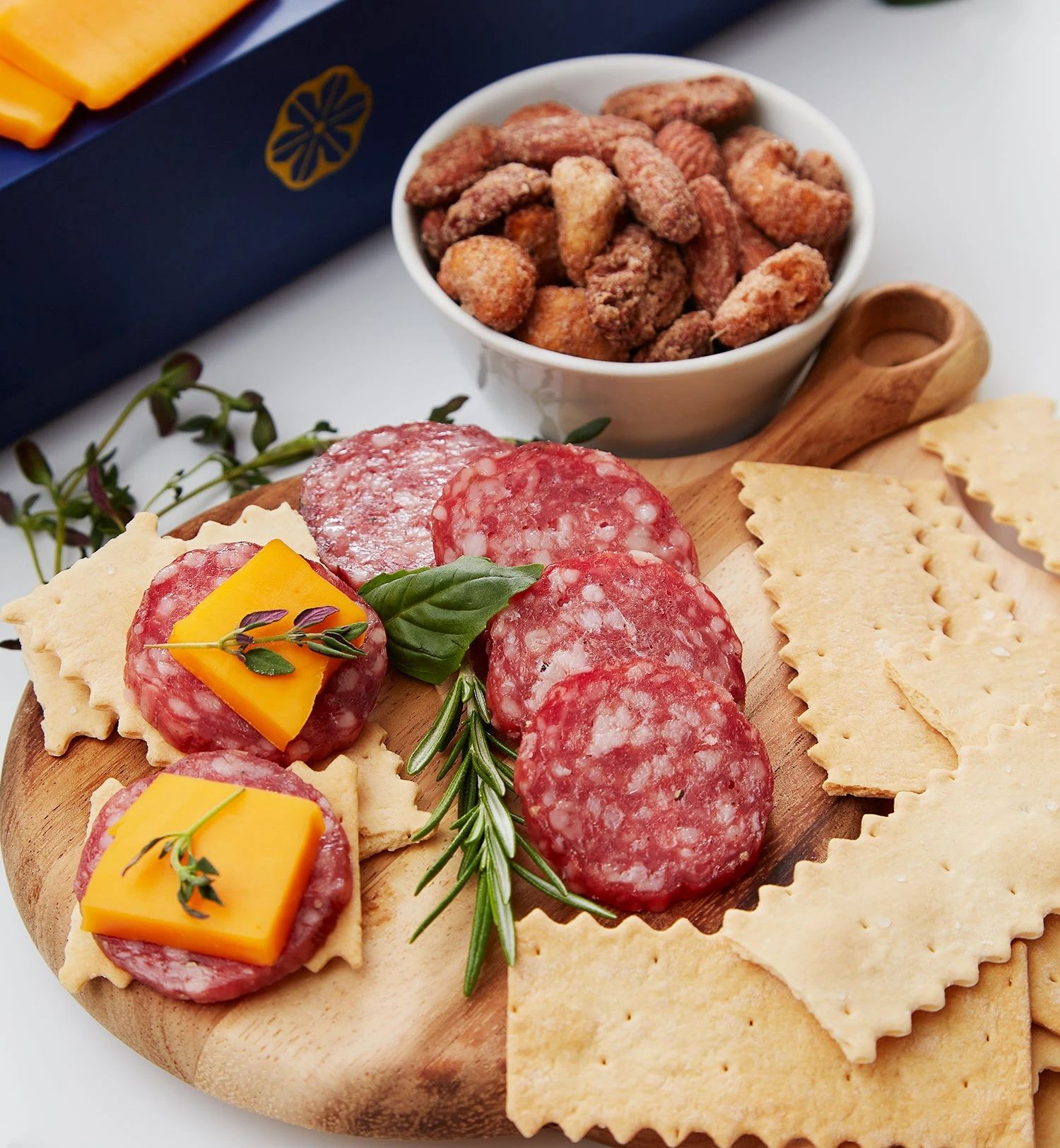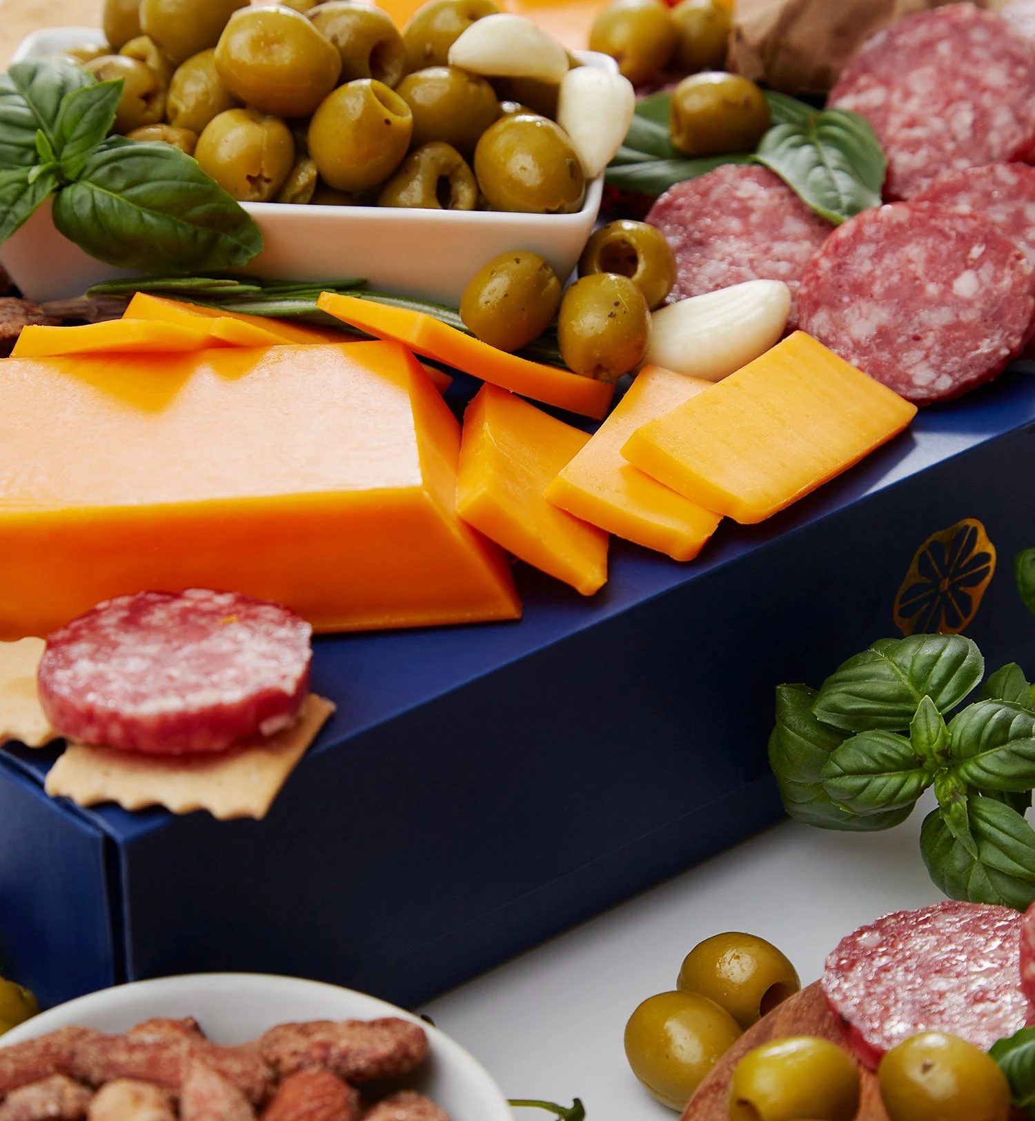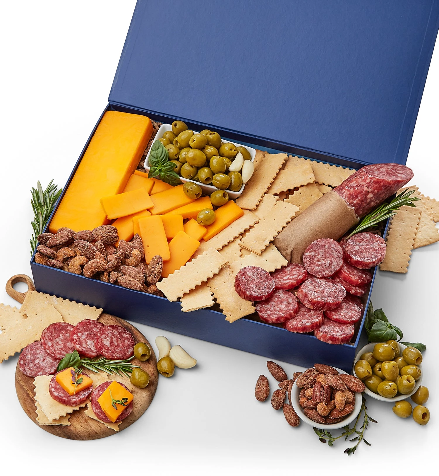 A symphony of bold and savory flavors and artisanal treats, the Savory Celebration Gift Box brings together everything needed to impress at any gathering. Inside, you’ll find a sharp, creamy Cheddar Bar, perfectly complemented by a Gentile Salami Chub crafted with old-world care. Basil & Garlic Pitted Green Olives add a bright, briny twist, while Everything Goes Nuts offers a satisfying crunch of sweet, salty, and savory. Complete the spread with crispy, buttery Rustic Bakery Flatbreads, perfect for pairing with every bite.