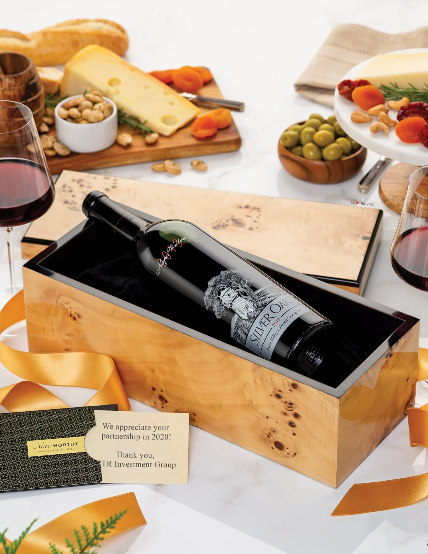 Silver Oak Napa Valley Cabernet Sauvignon is presented in our exclusive lacquered Burlwood keepsake box. Burlwood’s remarkable grain gives each piece its own true identity, making it an alluring gift.
