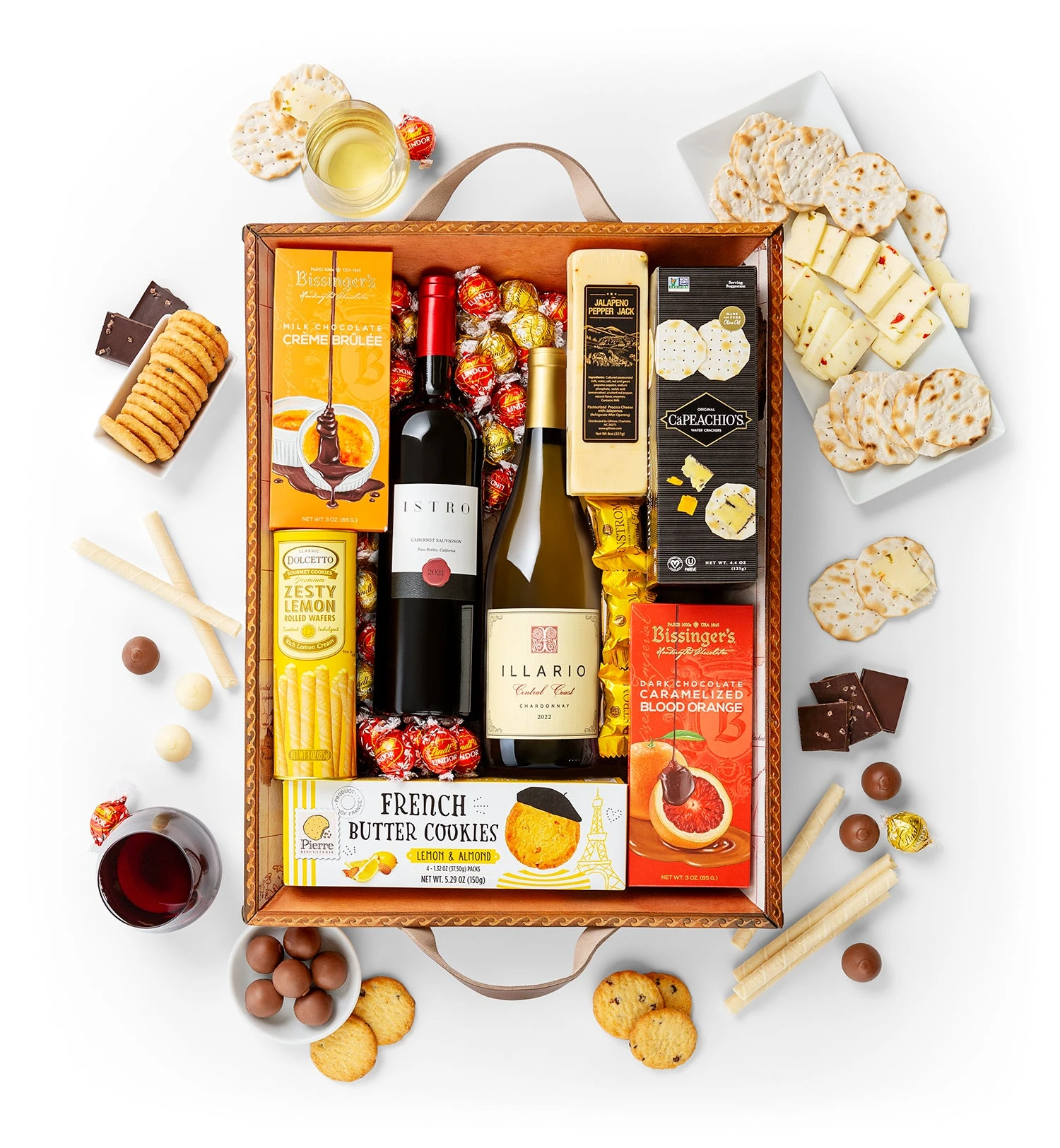 Give the gift of elevated taste with the Top of the World Gift Wine Tray—a beautifully curated selection of fine wine and gourmet delights, perfect for celebrating life’s special moments. This elegant tray features Istro Cabernet Sauvignon, a premium bottle of wine, and a crisp, fresh Illario Chardonnay. These wine pairings are carefully chosen for their rich flavors and smooth finish. From gourmet crackers and savory cheese to decadent chocolates, each item is thoughtfully selected to complement the wine and create an unforgettable tasting experience. All neatly nestled in a stately old-world tray.