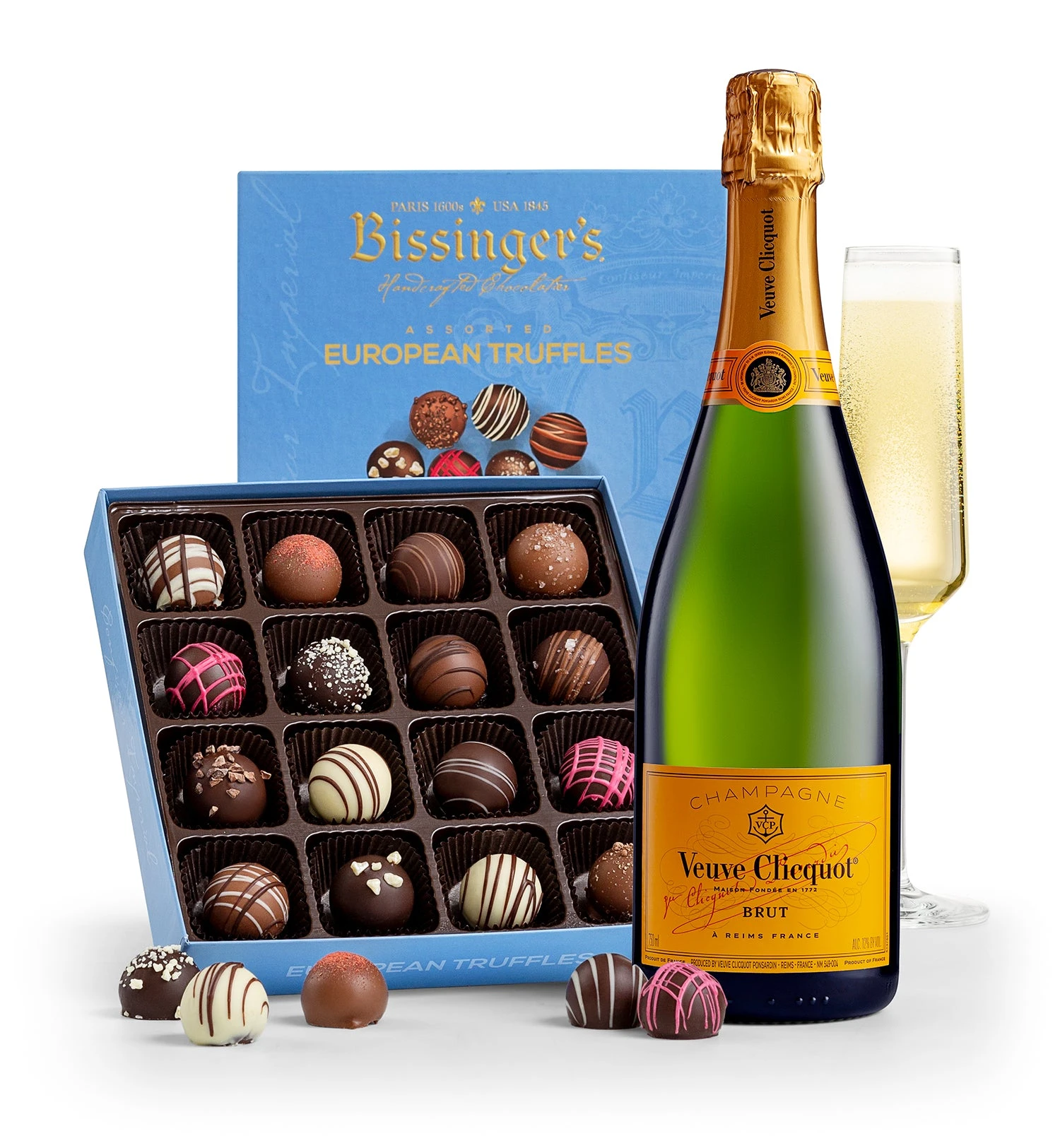 Celebrate life’s special moments with the Veuve Clicquot and Bissinger’s European Truffles Gift Set, a luxurious pairing that combines the iconic taste of Veuve Clicquot Champagne with the decadent richness of Bissinger’s handcrafted truffles. This elegant set is the perfect indulgence for any occasion. Complementing this champagne is a curated selection of Bissinger’s European Truffles, handcrafted with the finest ingredients. These decadent truffles melt effortlessly, revealing a luscious range of flavors, from silky dark chocolate to creamy ganache. Together, the combination of champagne and artisanal chocolate creates an indulgent tasting experience that delights the senses.