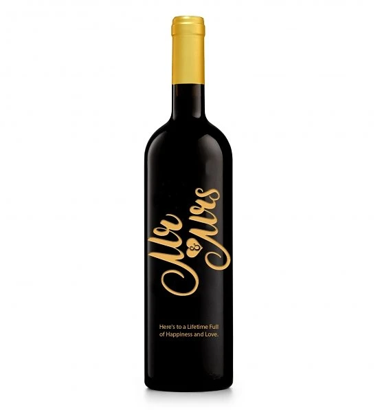 Send your best wishes with this elegant bottle of California red wine, glimmering with a lustrous “Mr & Mrs” script graphic, as well as your own personal message. Perfect for wedding or anniversary celebrations, this unique gift is definitely one they’ll cherish!